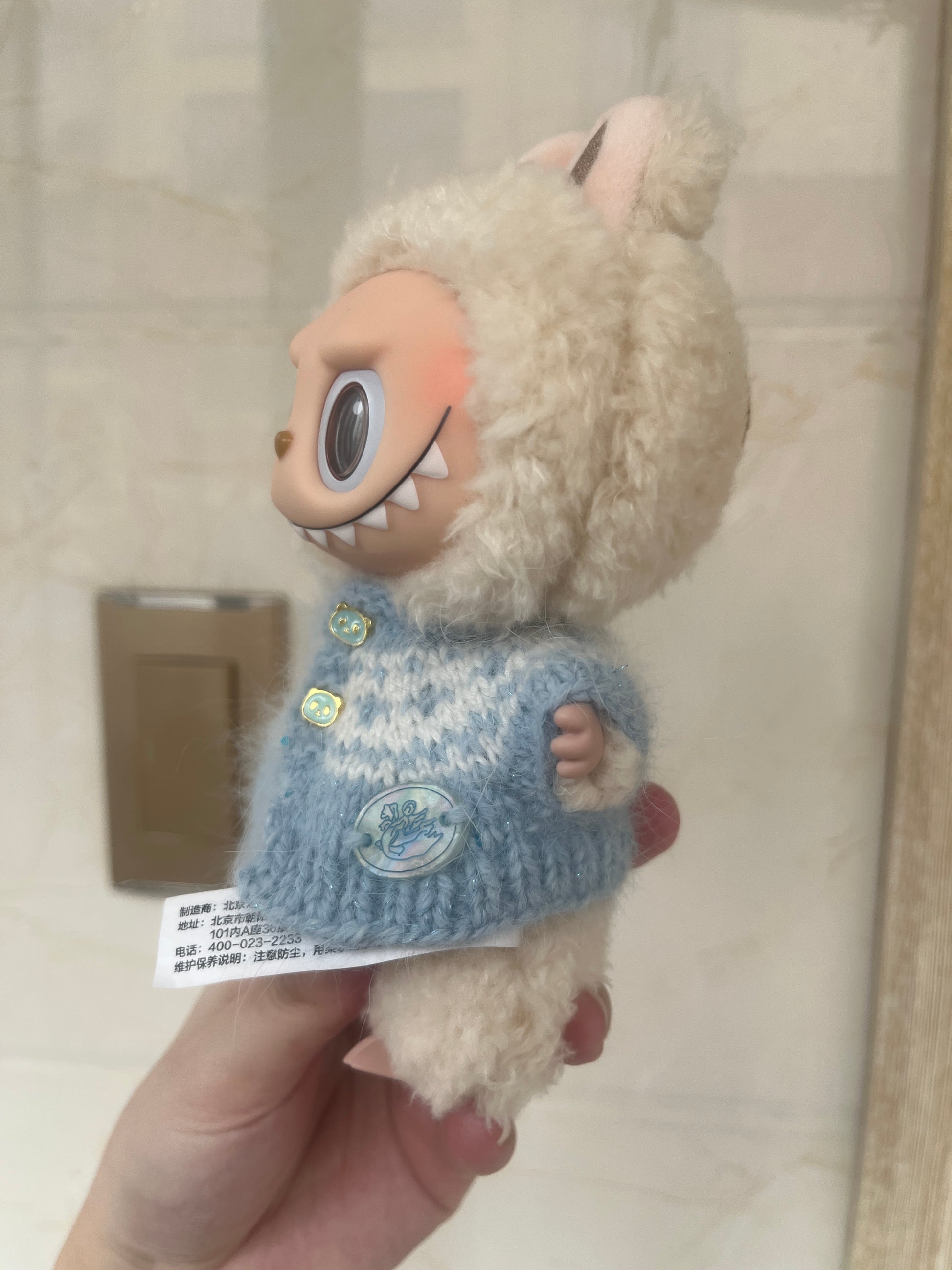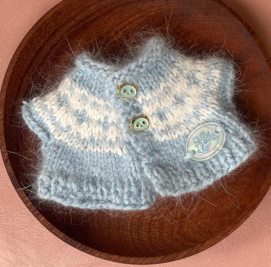 This handmade gradient cardigan is designed for 13–17cm dolls including Sniff&Pop Cozy Bunny, Labubu, and other similarly sized plushies. Knitted from soft blue and cream yarn, it features double-button detailing and a cute character badge. Perfect for daily styling, cozy photos, or collectible looks.