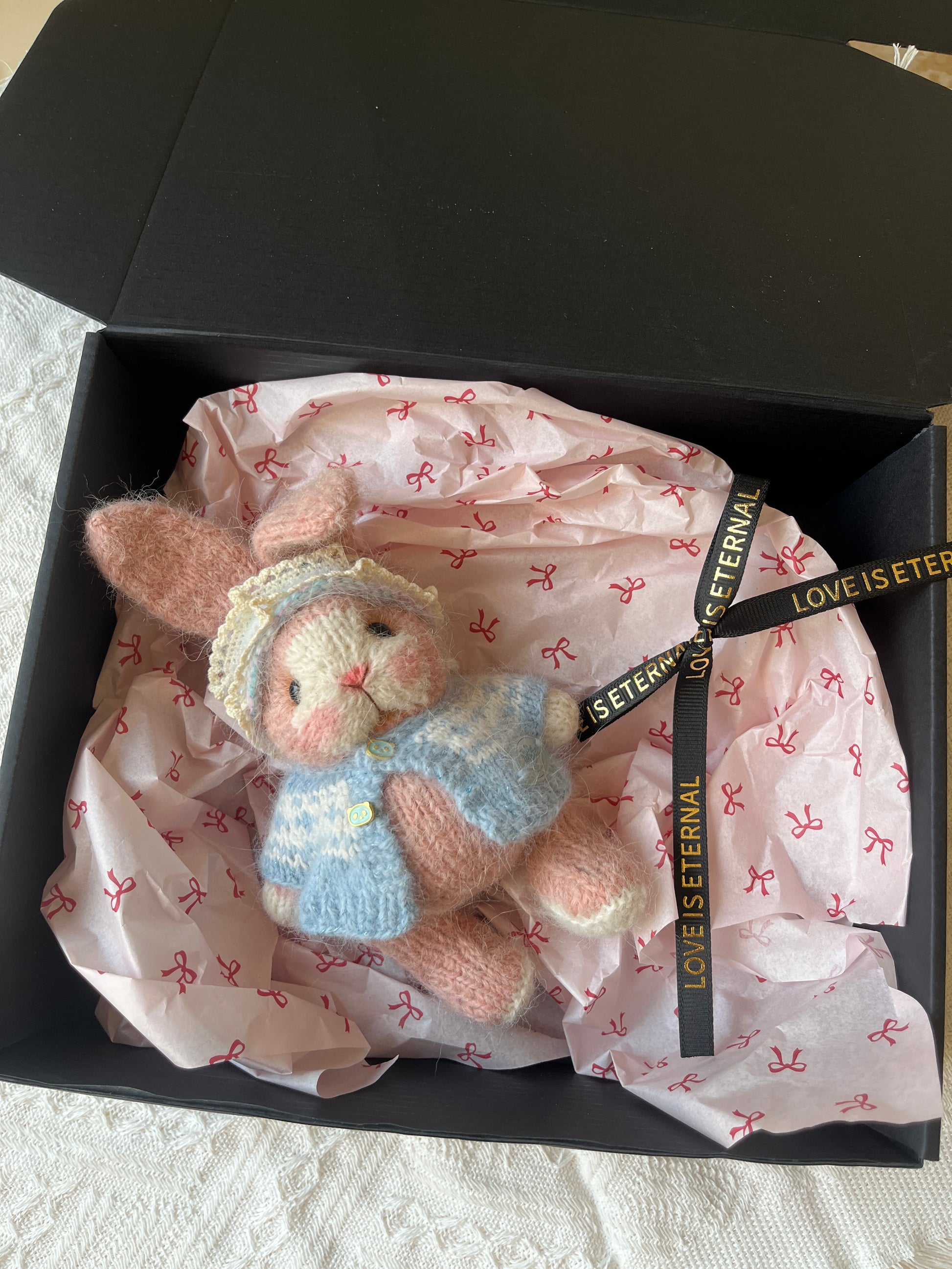 Mimi is the softest morning greeting you’ll ever meet. With her pink alpaca yarn body, blue-and-white gradient cardigan, and cream lace headband, she brings gentle joy to your day.