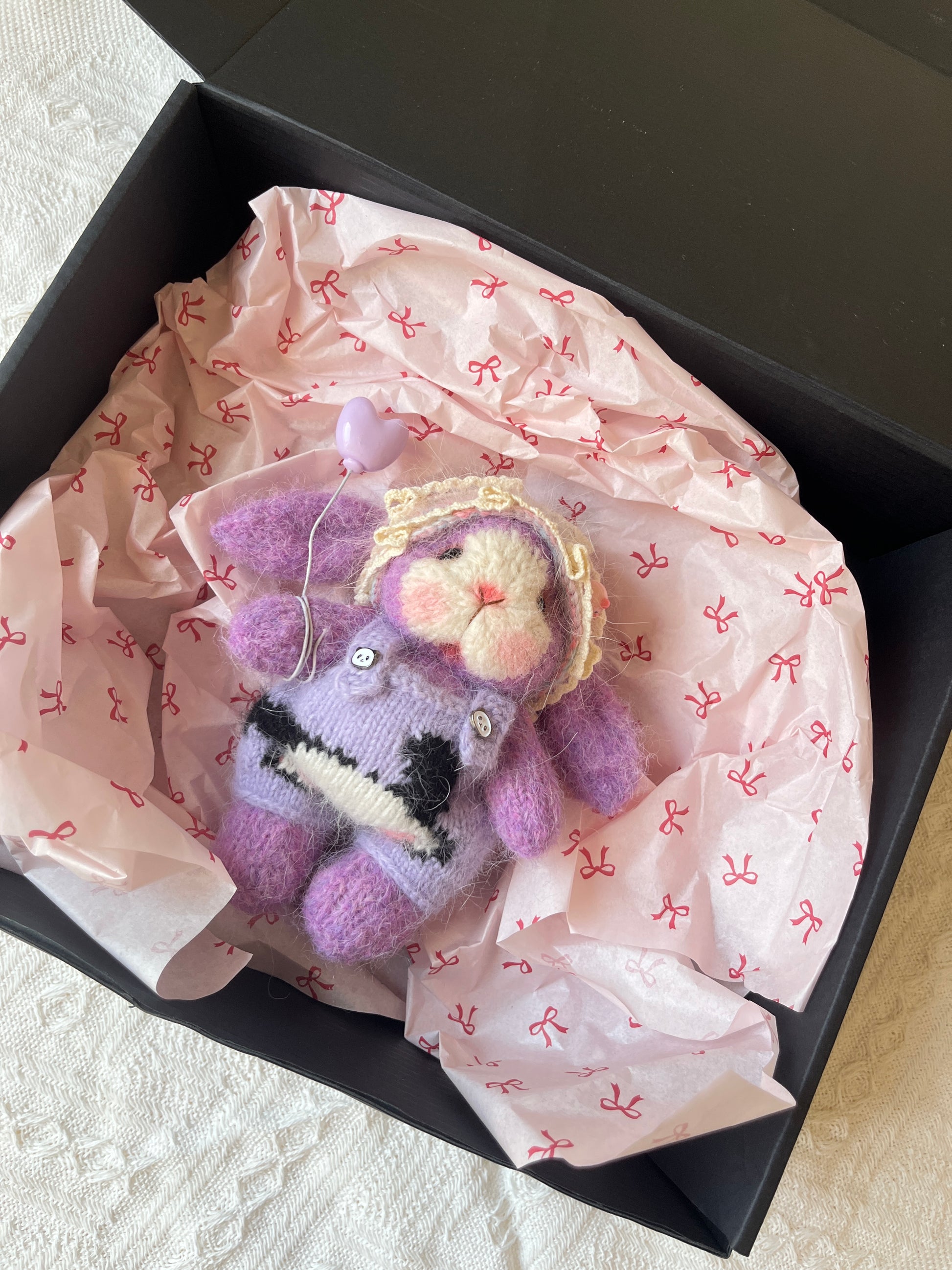 Meet Nina – a dreamy bunny in lavender tones, carrying a heart-shaped balloon and wearing a bunny-embroidered wool outfit. Her soft gaze, rosy cheeks, and lace headband bring a gentle magic to your day. She’s here to spark delight and comfort, one dream at a time.